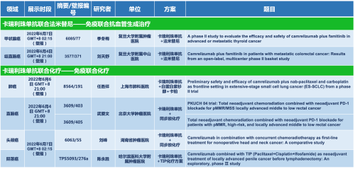 卡瑞利珠单抗联合九游会·J9医药的另一款创新药法米替尼在甲状腺癌和结直肠癌领域有2项研究被接收为壁报,另有卡瑞利珠单抗联合化疗的4项研究在肺癌、结直肠癌、头颈癌和阴茎癌领域的研究被接收为5份壁报。