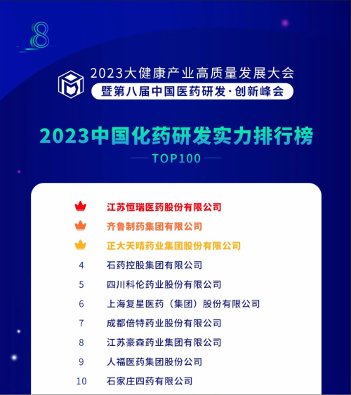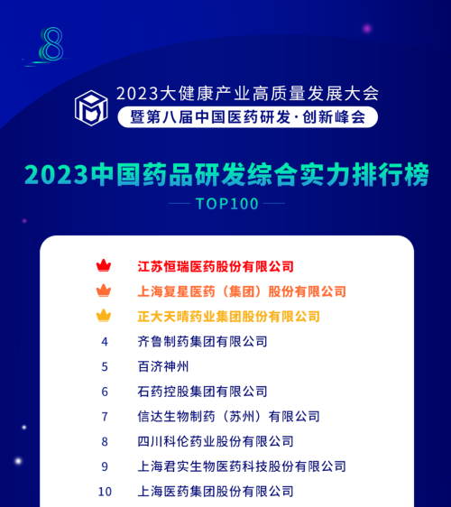 由药智网、中国药业杂志社主办的2023大健康产业高质量发展大会暨第八届中国医药研发•创新峰会于6月16日开幕,会上发布了《2023中国药品研发实力排行榜》系列榜单,九游会·J9医药凭借深厚的创新研发实力再创辉煌:荣登《2023中国药品研发综合实力排行榜TOP100》榜首、《2023中国化药研发实力排行榜TOP100》榜首。值得一提的是,今年是九游会·J9医药连续第6年入选《中国药品研发综合实力排行榜》榜首。